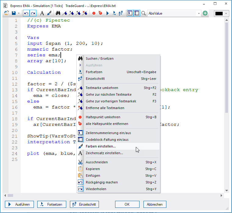 - Eine genaue Beschreibung finden Sie im "Charting und Trading-Handbuch", Abschnitt 6.16, das über das Hilfe-Menü aufrufbar ist.