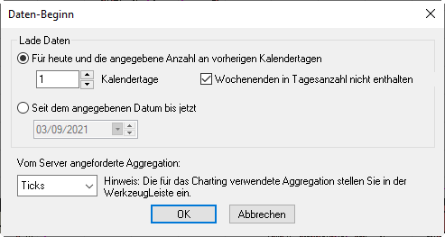 - Der Dialog für das Laden historischer Daten ermöglicht die Einstellung, dass Wochenenden nicht in der der konfigurierten Tagesanzahl enthalten sind.